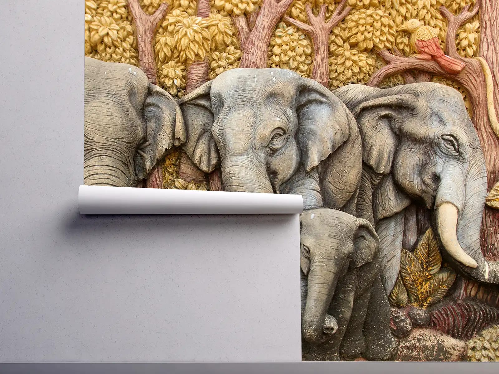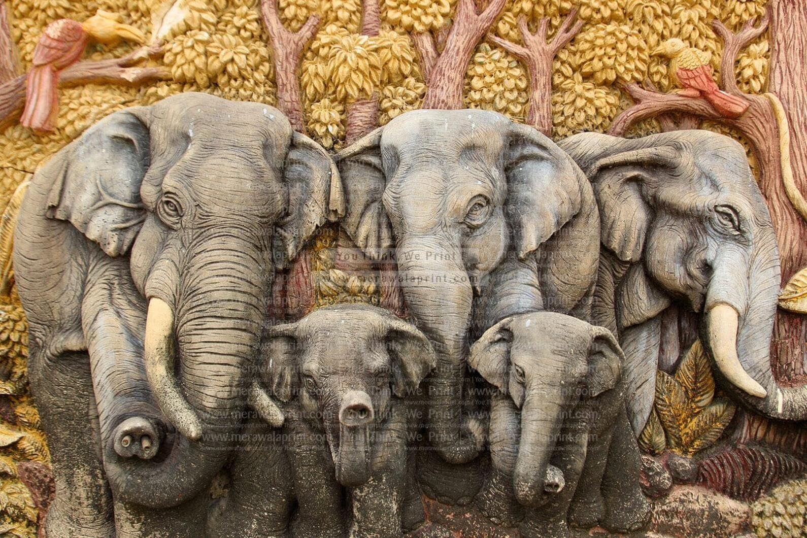 Add a touch of tradition and nature to your interiors with this beautifully crafted 3D plaster wall art of elephants. This intricate mural features a majestic elephant family sculpted in high relief, inspired by native Thai-style molding art. Surrounded by carved trees and birds, this mural creates a warm, earthy ambiance perfect for living rooms, meditation spaces, restaurants, or cultural centers.