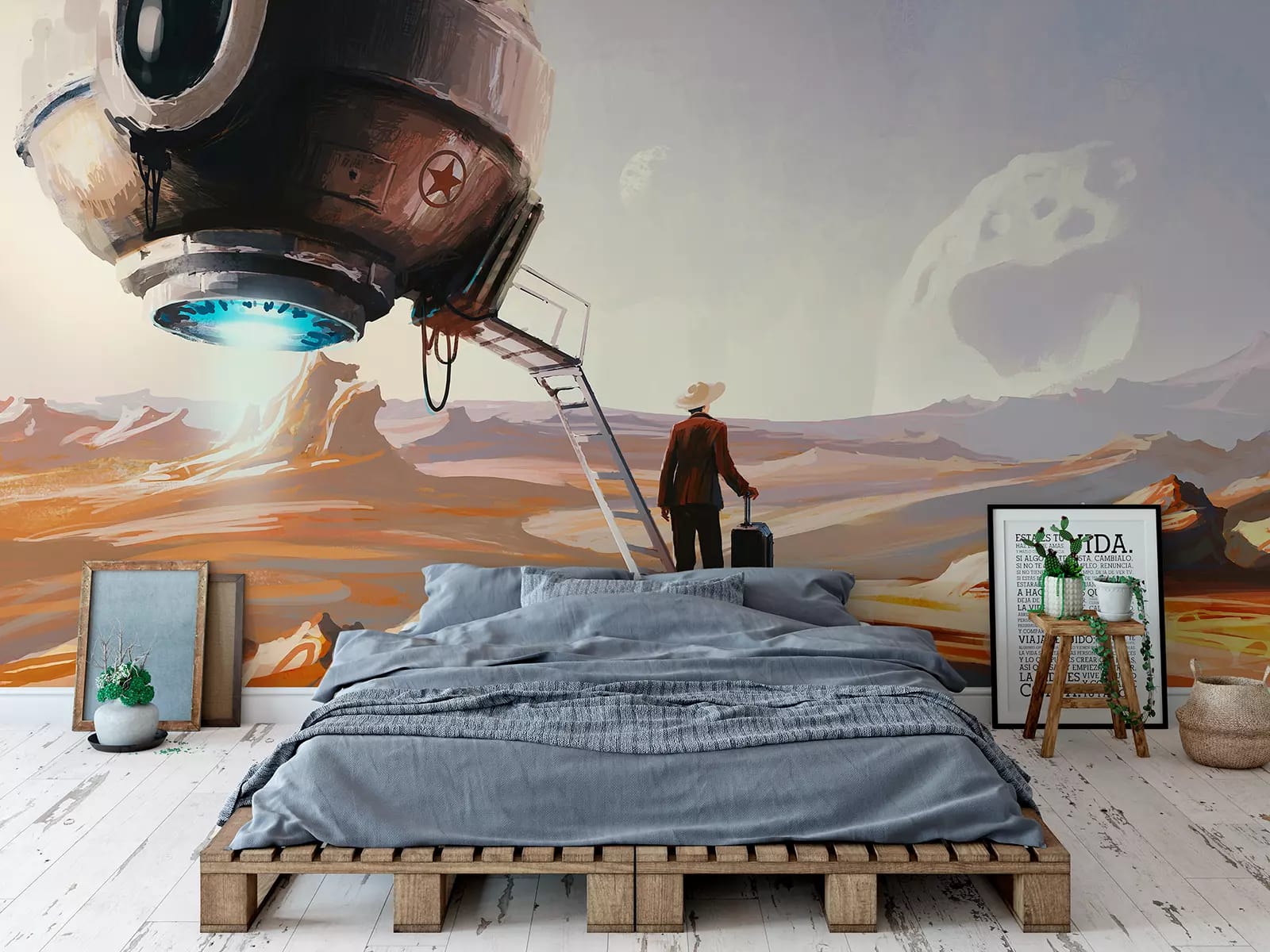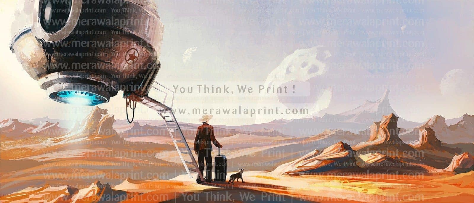Hand painted illustration of an alien craft with alien landing on an alien planet. | MWP006SFW