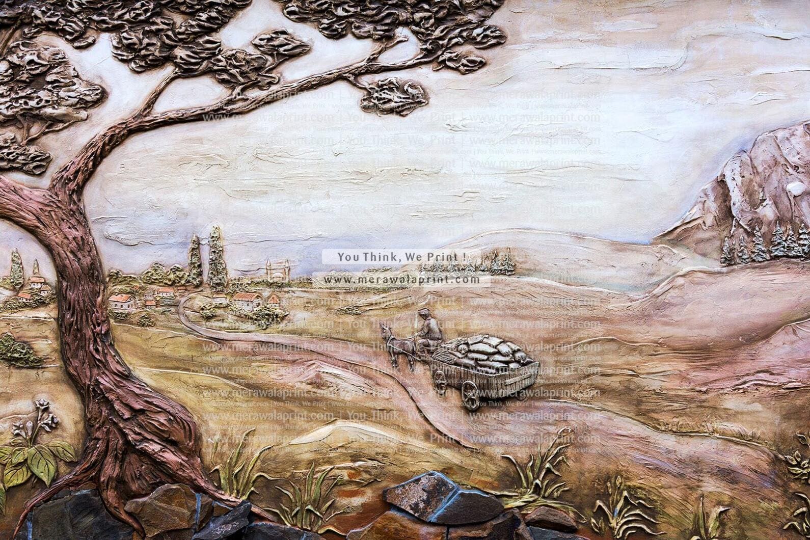 Vintage old fresco decoration on the wall rural landscape of an old village in Evpatoria